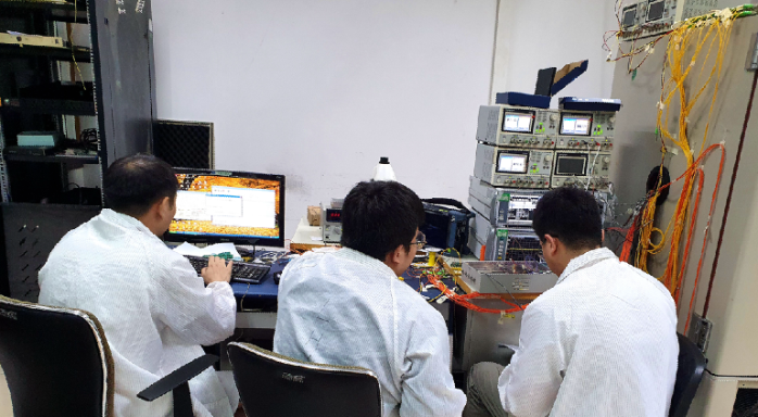 驗證與測試工作也馬不停蹄。產品初樣焊裝完成后,光傳輸部員工絲毫沒有歇息,立刻緊鑼密鼓地投入到了調試和改進工作中。從調試的第一天開始,相關負責人就從未離開第一線,時時刻刻都在指揮協調,甚至還與驗證與測試員工一起設置溫箱、記錄數據、測試流程、改進軟件,焊線、接線、調儀器……他們齊心協力堅守崗位,周末無休,終于,在大家的共同努力下,國產化光轉換組件通過一次次評審,開始為用戶供貨!